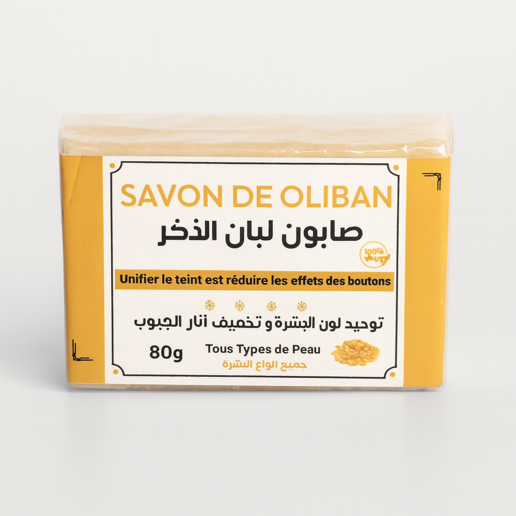 Frankincense Olibanum Soap is a natural cleansing bar inspired by Moroccan skin care rituals. It is made with frankincense (olibanum), a plant resin long used for skin care and fragrance. This soap helps cleanse the skin deeply while helping to support a clearer, more even tone. It also leaves a mild, warm scent and feels gentle on the skin, making it suitable for daily use in your body care routine.